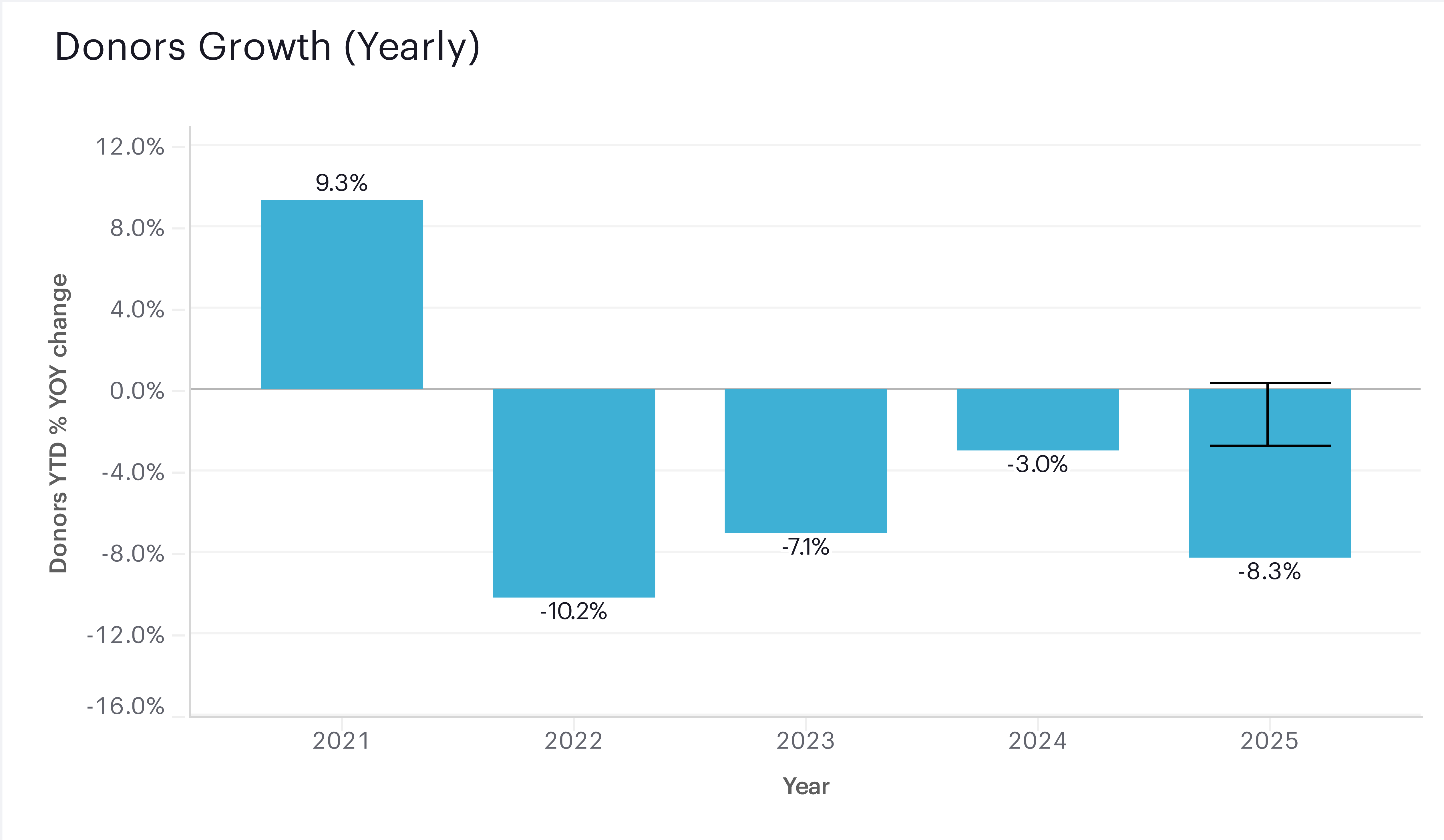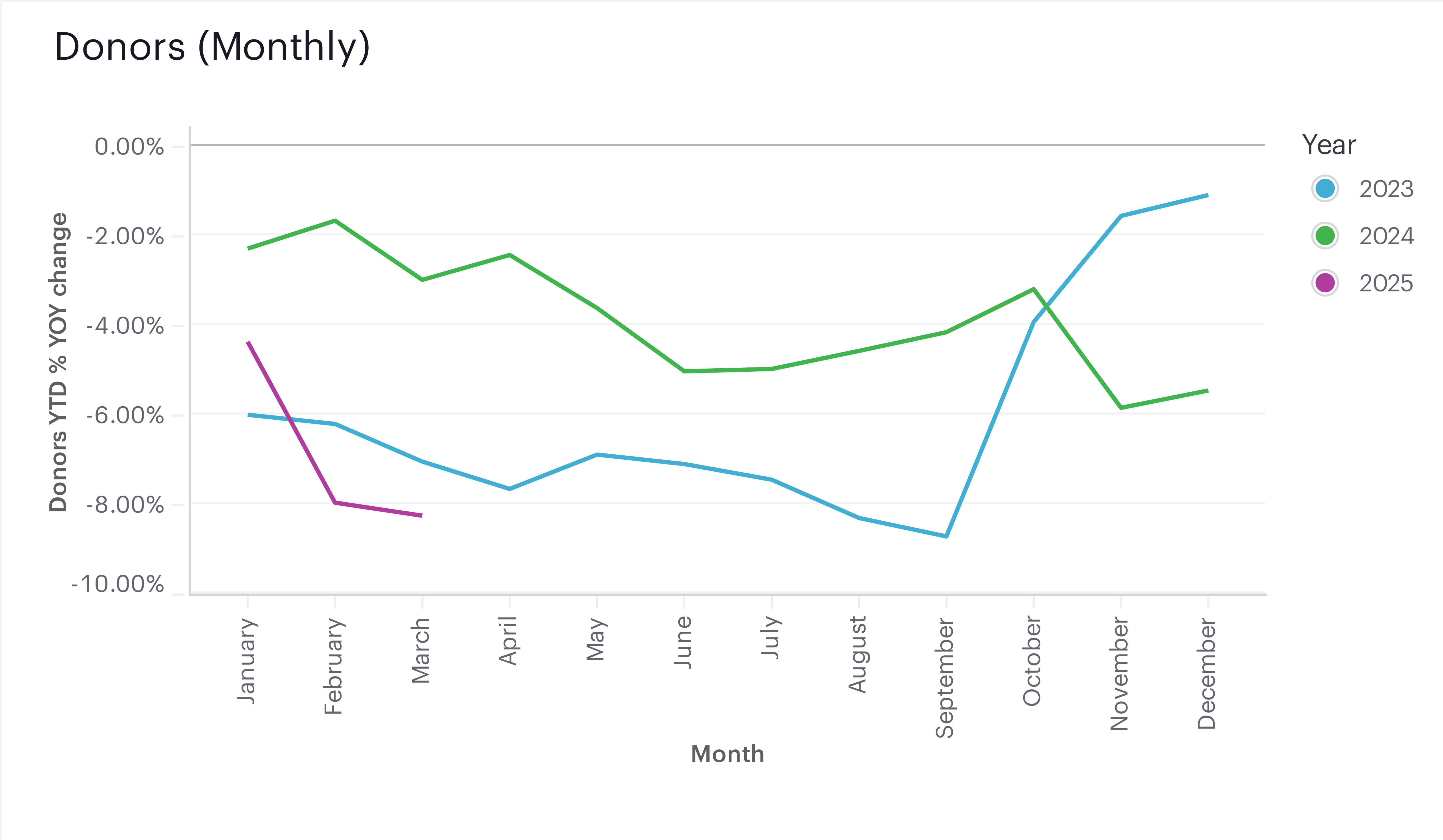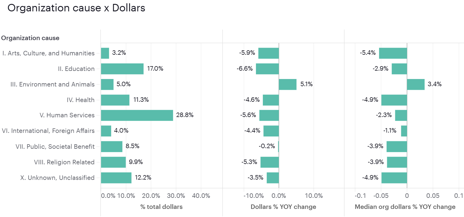 We removed organizations that did not have a minimum of 25 donations and $5,000 in revenue in each of the previous three years. We removed organizations at either tail of the revenue growth curve. If revenue growth was more than 300% or less than -66% in any of the past three years, organizations were removed. We also excluded individual contributions above $10M. We weighted our data by organization size and NTEE major group to make it reflective of 2018 IRS filers in the $5K - $25M range of contributions. Details regarding estimation methodology for late reported data can be found here.